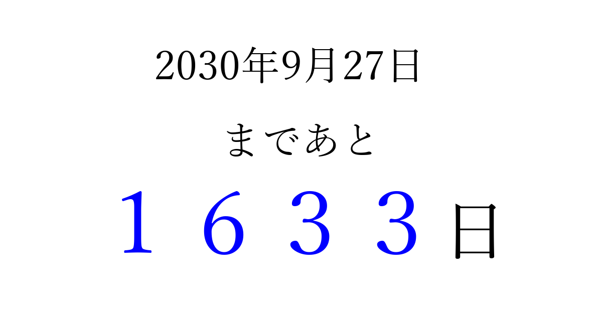 2030年9月27日(金)まで あと 9999 日です 追加すると、トップページからすぐ選べるようになります ※2026/04/08現在の結果です。 最新の状態に更新する ↓シェアして、タイムライン上にカウントダウンを表示しよう!↓ 📤 この結果を共有する Tweet シェア Threads Bluesky 別の日付でカウントダウン 2030年9月のカレンダー このページをブックマークに追加すると、いつでもカウントダウンを確認できます。 (PC: Ctrl+D / Mac: ⌘+D) hitome-notes.comでは以下のページも運営しています。 指定日と期間から日付を計算 | ガチャ確率計算・シミュレーション | プライバシー・ポリシー 運営者:Avocado
