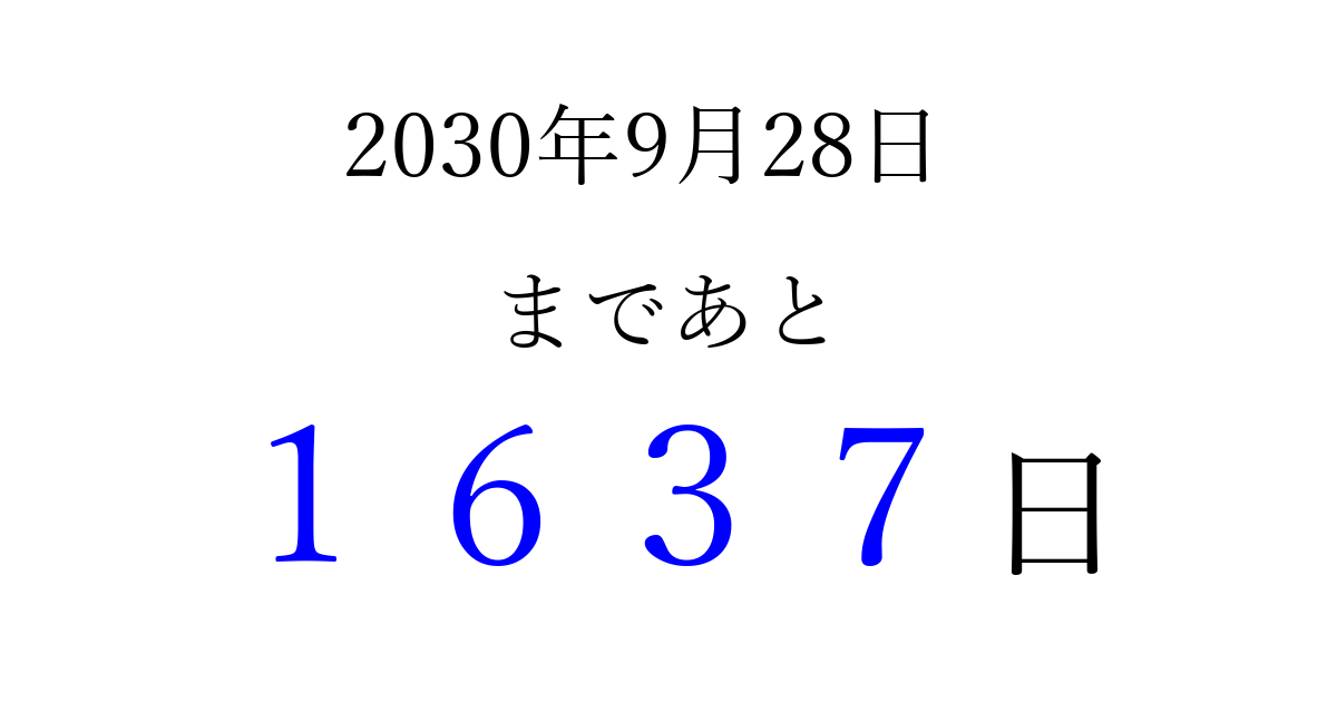 2030年9月28日(土)まで あと 9999 日です 追加すると、トップページからすぐ選べるようになります ※2026/04/05現在の結果です。 最新の状態に更新する ↓シェアして、タイムライン上にカウントダウンを表示しよう!↓ 📤 この結果を共有する Tweet シェア Threads Bluesky 別の日付でカウントダウン 2030年9月のカレンダー このページをブックマークに追加すると、いつでもカウントダウンを確認できます。 (PC: Ctrl+D / Mac: ⌘+D) hitome-notes.comでは以下のページも運営しています。 指定日と期間から日付を計算 | ガチャ確率計算・シミュレーション | プライバシー・ポリシー 運営者:Avocado