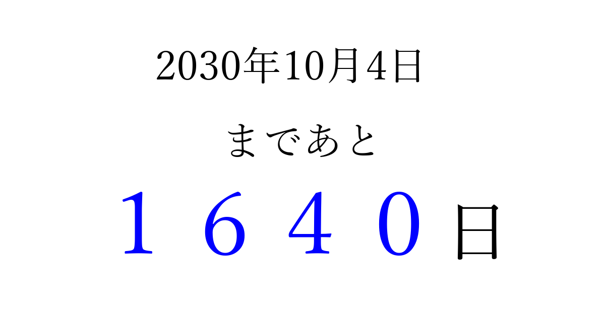 2030年10月4日(金)まで あと 9999 日です 追加すると、トップページからすぐ選べるようになります ※2026/04/08現在の結果です。 最新の状態に更新する ↓シェアして、タイムライン上にカウントダウンを表示しよう!↓ 📤 この結果を共有する Tweet シェア Threads Bluesky 別の日付でカウントダウン 2030年10月のカレンダー このページをブックマークに追加すると、いつでもカウントダウンを確認できます。 (PC: Ctrl+D / Mac: ⌘+D) hitome-notes.comでは以下のページも運営しています。 指定日と期間から日付を計算 | ガチャ確率計算・シミュレーション | プライバシー・ポリシー 運営者:Avocado