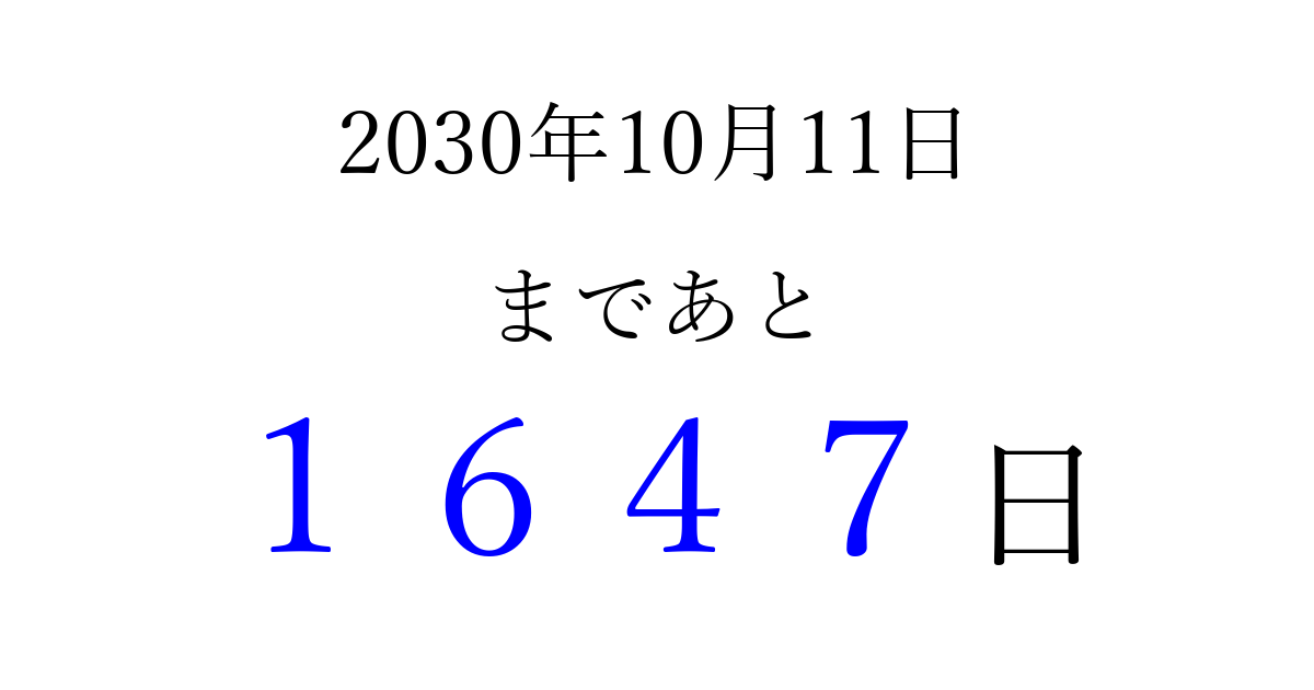2030年10月11日(金)まで あと 9999 日です 追加すると、トップページからすぐ選べるようになります ※2026/04/08現在の結果です。 最新の状態に更新する ↓シェアして、タイムライン上にカウントダウンを表示しよう!↓ 📤 この結果を共有する Tweet シェア Threads Bluesky 別の日付でカウントダウン 2030年10月のカレンダー このページをブックマークに追加すると、いつでもカウントダウンを確認できます。 (PC: Ctrl+D / Mac: ⌘+D) hitome-notes.comでは以下のページも運営しています。 指定日と期間から日付を計算 | ガチャ確率計算・シミュレーション | プライバシー・ポリシー 運営者:Avocado