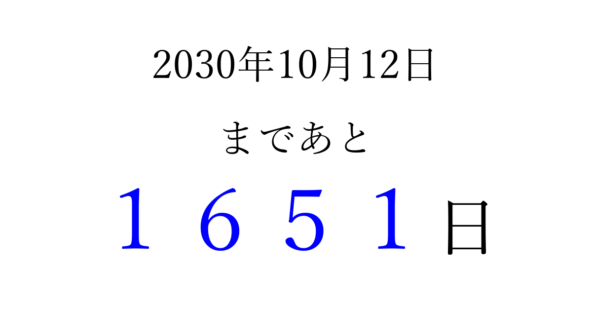 2030年10月12日(土)まで あと 9999 日です 追加すると、トップページからすぐ選べるようになります ※2026/04/05現在の結果です。 最新の状態に更新する ↓シェアして、タイムライン上にカウントダウンを表示しよう!↓ 📤 この結果を共有する Tweet シェア Threads Bluesky 別の日付でカウントダウン 2030年10月のカレンダー このページをブックマークに追加すると、いつでもカウントダウンを確認できます。 (PC: Ctrl+D / Mac: ⌘+D) hitome-notes.comでは以下のページも運営しています。 指定日と期間から日付を計算 | ガチャ確率計算・シミュレーション | プライバシー・ポリシー 運営者:Avocado