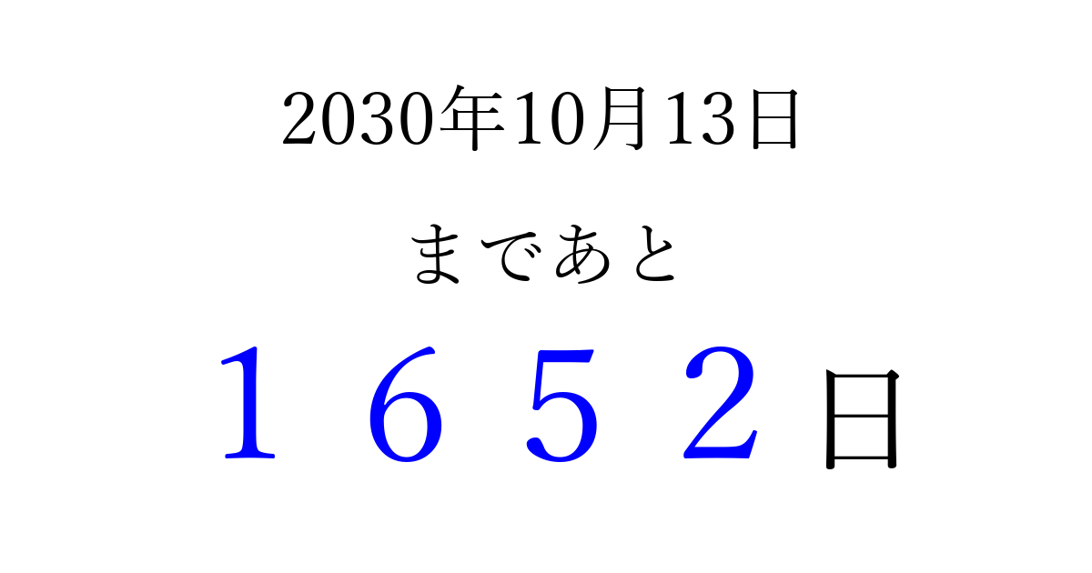 2030年10月13日(日)まで あと 9999 日です 追加すると、トップページからすぐ選べるようになります ※2026/04/05現在の結果です。 最新の状態に更新する ↓シェアして、タイムライン上にカウントダウンを表示しよう!↓ 📤 この結果を共有する Tweet シェア Threads Bluesky 別の日付でカウントダウン 2030年10月のカレンダー このページをブックマークに追加すると、いつでもカウントダウンを確認できます。 (PC: Ctrl+D / Mac: ⌘+D) hitome-notes.comでは以下のページも運営しています。 指定日と期間から日付を計算 | ガチャ確率計算・シミュレーション | プライバシー・ポリシー 運営者:Avocado