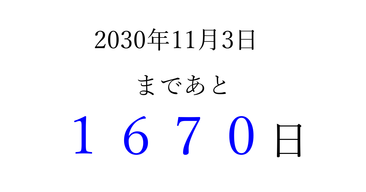 2030年11月3日(日)まで あと 9999 日です 追加すると、トップページからすぐ選べるようになります ※2026/04/08現在の結果です。 最新の状態に更新する ↓シェアして、タイムライン上にカウントダウンを表示しよう!↓ 📤 この結果を共有する Tweet シェア Threads Bluesky 別の日付でカウントダウン 2030年11月のカレンダー このページをブックマークに追加すると、いつでもカウントダウンを確認できます。 (PC: Ctrl+D / Mac: ⌘+D) hitome-notes.comでは以下のページも運営しています。 指定日と期間から日付を計算 | ガチャ確率計算・シミュレーション | プライバシー・ポリシー 運営者:Avocado