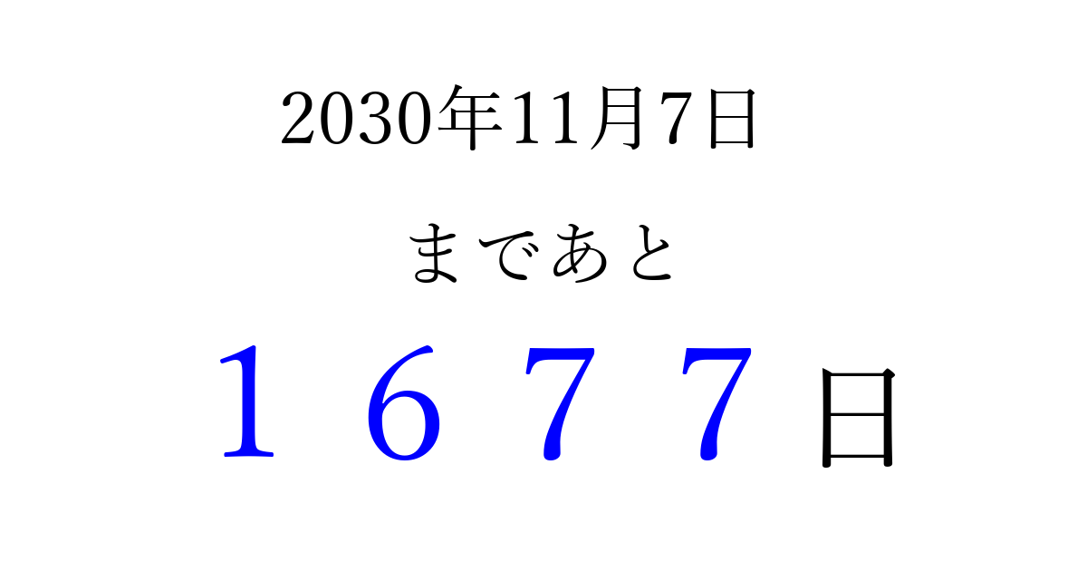 2030年11月7日(木)まで あと 9999 日です 追加すると、トップページからすぐ選べるようになります ※2026/04/05現在の結果です。 最新の状態に更新する ↓シェアして、タイムライン上にカウントダウンを表示しよう!↓ 📤 この結果を共有する Tweet シェア Threads Bluesky 別の日付でカウントダウン 2030年11月のカレンダー このページをブックマークに追加すると、いつでもカウントダウンを確認できます。 (PC: Ctrl+D / Mac: ⌘+D) hitome-notes.comでは以下のページも運営しています。 指定日と期間から日付を計算 | ガチャ確率計算・シミュレーション | プライバシー・ポリシー 運営者:Avocado