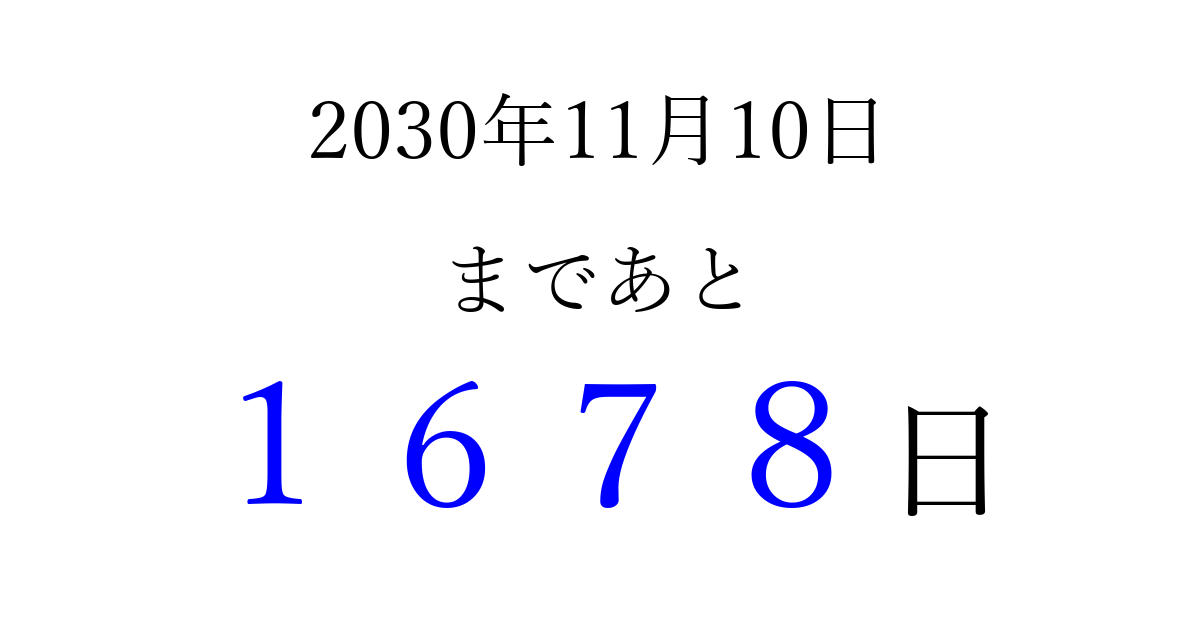 2030年11月10日(日)まで あと 9999 日です 追加すると、トップページからすぐ選べるようになります ※2026/04/07現在の結果です。 最新の状態に更新する ↓シェアして、タイムライン上にカウントダウンを表示しよう!↓ 📤 この結果を共有する Tweet シェア Threads Bluesky 別の日付でカウントダウン 2030年11月のカレンダー このページをブックマークに追加すると、いつでもカウントダウンを確認できます。 (PC: Ctrl+D / Mac: ⌘+D) hitome-notes.comでは以下のページも運営しています。 指定日と期間から日付を計算 | ガチャ確率計算・シミュレーション | プライバシー・ポリシー 運営者:Avocado