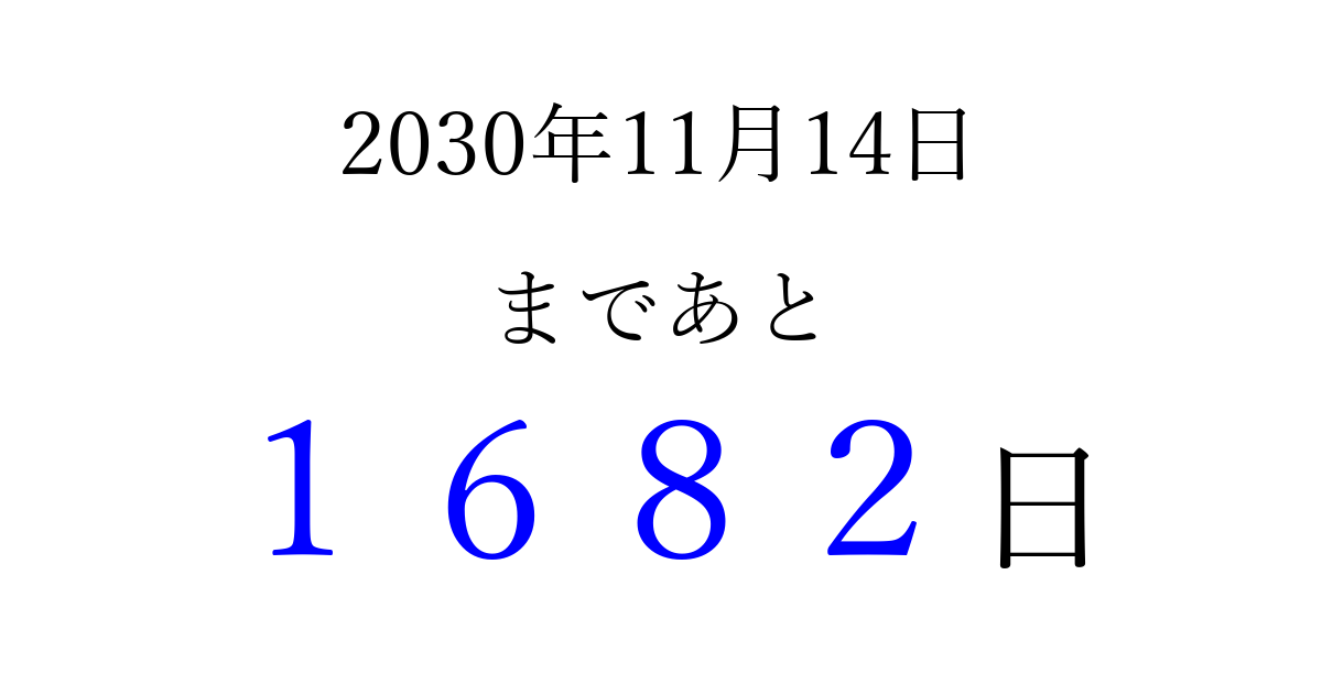 2030年11月14日(木)まで あと 9999 日です 追加すると、トップページからすぐ選べるようになります ※2026/04/07現在の結果です。 最新の状態に更新する ↓シェアして、タイムライン上にカウントダウンを表示しよう!↓ 📤 この結果を共有する Tweet シェア Threads Bluesky 別の日付でカウントダウン 2030年11月のカレンダー このページをブックマークに追加すると、いつでもカウントダウンを確認できます。 (PC: Ctrl+D / Mac: ⌘+D) hitome-notes.comでは以下のページも運営しています。 指定日と期間から日付を計算 | ガチャ確率計算・シミュレーション | プライバシー・ポリシー 運営者:Avocado
