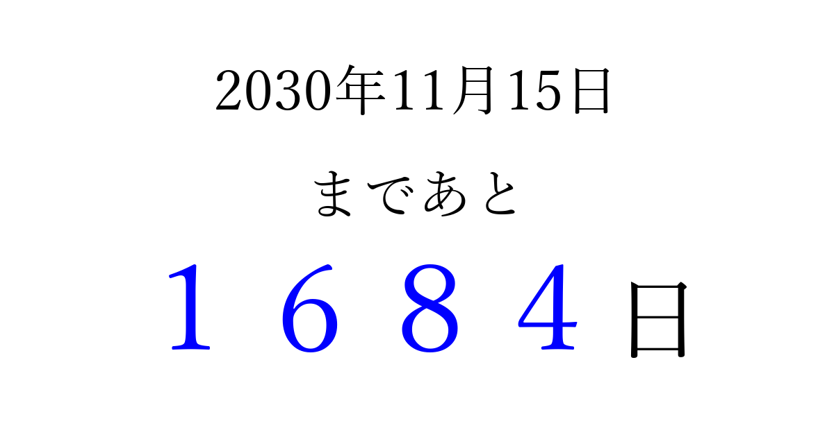 2030年11月15日(金)まで あと 9999 日です 追加すると、トップページからすぐ選べるようになります ※2026/04/06現在の結果です。 最新の状態に更新する ↓シェアして、タイムライン上にカウントダウンを表示しよう!↓ 📤 この結果を共有する Tweet シェア Threads Bluesky 別の日付でカウントダウン 2030年11月のカレンダー このページをブックマークに追加すると、いつでもカウントダウンを確認できます。 (PC: Ctrl+D / Mac: ⌘+D) hitome-notes.comでは以下のページも運営しています。 指定日と期間から日付を計算 | ガチャ確率計算・シミュレーション | プライバシー・ポリシー 運営者:Avocado