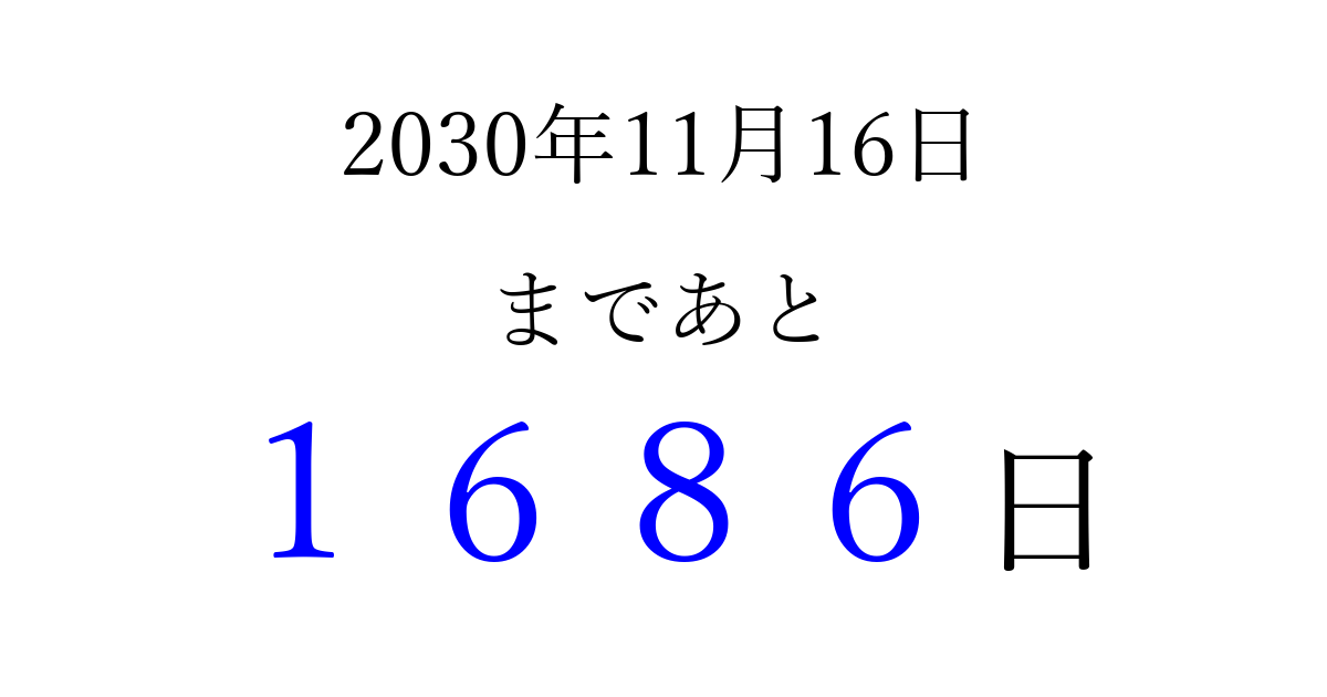 2030年11月16日(土)まで あと 9999 日です 追加すると、トップページからすぐ選べるようになります ※2026/04/05現在の結果です。 最新の状態に更新する ↓シェアして、タイムライン上にカウントダウンを表示しよう!↓ 📤 この結果を共有する Tweet シェア Threads Bluesky 別の日付でカウントダウン 2030年11月のカレンダー このページをブックマークに追加すると、いつでもカウントダウンを確認できます。 (PC: Ctrl+D / Mac: ⌘+D) hitome-notes.comでは以下のページも運営しています。 指定日と期間から日付を計算 | ガチャ確率計算・シミュレーション | プライバシー・ポリシー 運営者:Avocado