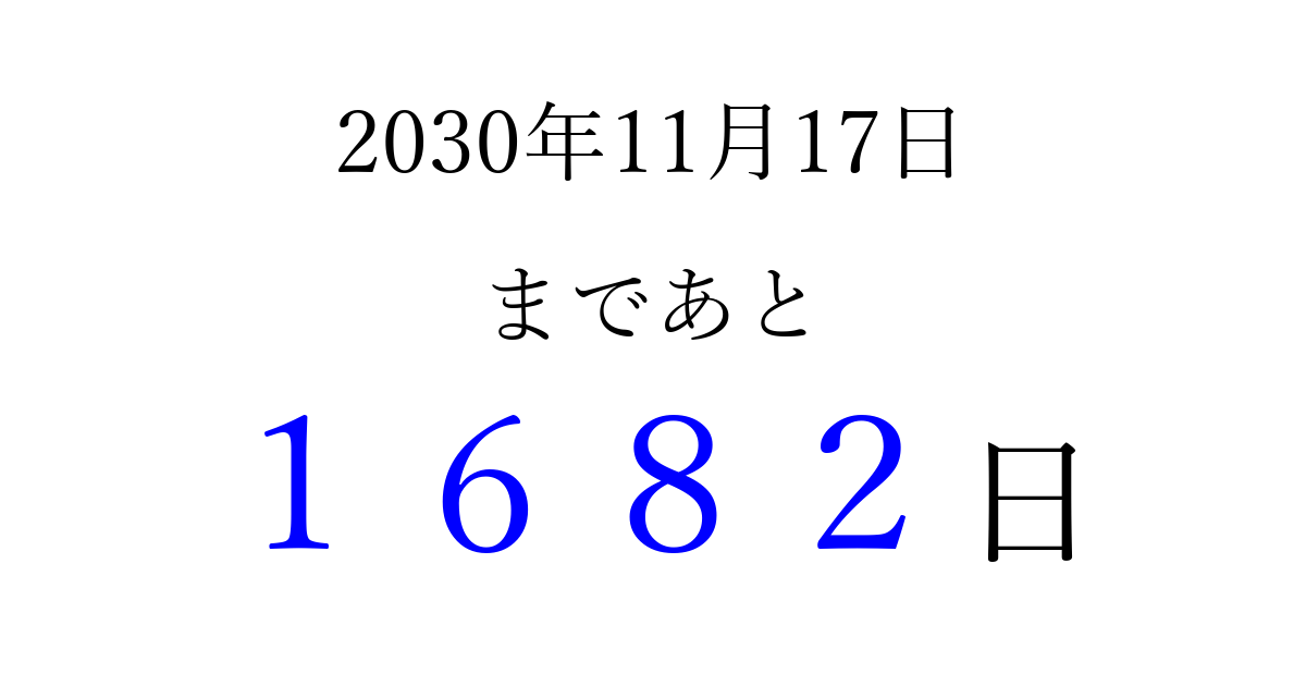 2030年11月17日(日)まで あと 9999 日です 追加すると、トップページからすぐ選べるようになります ※2026/04/10現在の結果です。 最新の状態に更新する ↓シェアして、タイムライン上にカウントダウンを表示しよう!↓ 📤 この結果を共有する Tweet シェア Threads Bluesky 別の日付でカウントダウン 2030年11月のカレンダー このページをブックマークに追加すると、いつでもカウントダウンを確認できます。 (PC: Ctrl+D / Mac: ⌘+D) hitome-notes.comでは以下のページも運営しています。 指定日と期間から日付を計算 | ガチャ確率計算・シミュレーション | プライバシー・ポリシー 運営者:Avocado