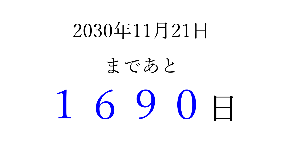 2030年11月21日(木)まで あと 9999 日です 追加すると、トップページからすぐ選べるようになります ※2026/04/06現在の結果です。 最新の状態に更新する ↓シェアして、タイムライン上にカウントダウンを表示しよう!↓ 📤 この結果を共有する Tweet シェア Threads Bluesky 別の日付でカウントダウン 2030年11月のカレンダー このページをブックマークに追加すると、いつでもカウントダウンを確認できます。 (PC: Ctrl+D / Mac: ⌘+D) hitome-notes.comでは以下のページも運営しています。 指定日と期間から日付を計算 | ガチャ確率計算・シミュレーション | プライバシー・ポリシー 運営者:Avocado