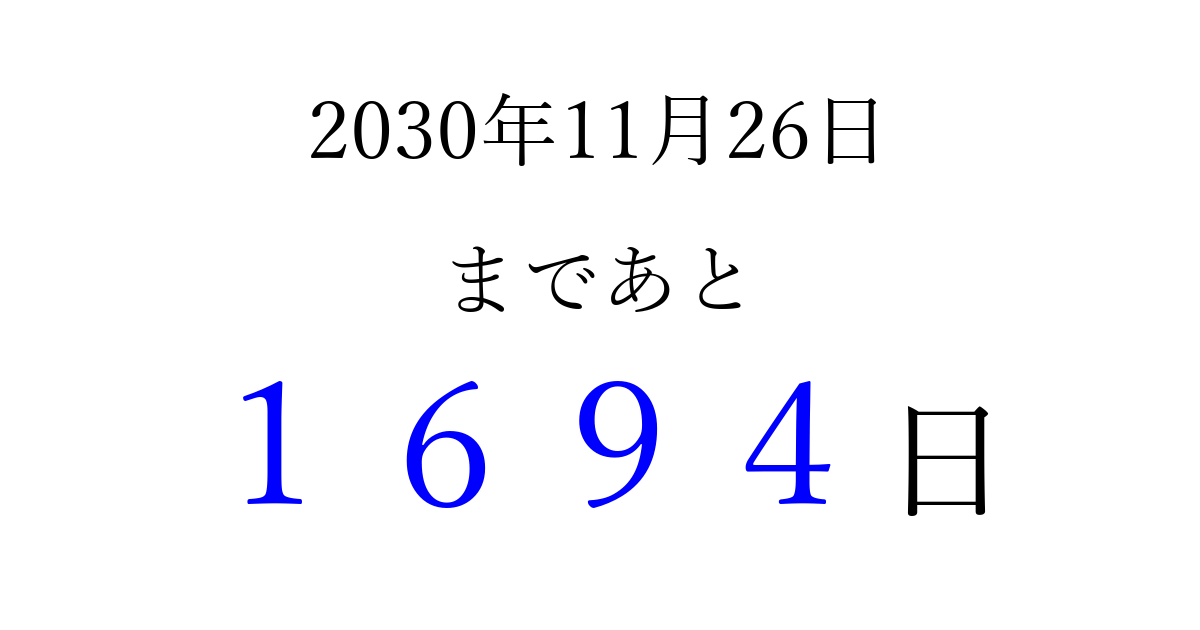 2030年11月26日(火)まで あと 9999 日です 追加すると、トップページからすぐ選べるようになります ※2026/04/07現在の結果です。 最新の状態に更新する ↓シェアして、タイムライン上にカウントダウンを表示しよう!↓ 📤 この結果を共有する Tweet シェア Threads Bluesky 別の日付でカウントダウン 2030年11月のカレンダー このページをブックマークに追加すると、いつでもカウントダウンを確認できます。 (PC: Ctrl+D / Mac: ⌘+D) hitome-notes.comでは以下のページも運営しています。 指定日と期間から日付を計算 | ガチャ確率計算・シミュレーション | プライバシー・ポリシー 運営者:Avocado