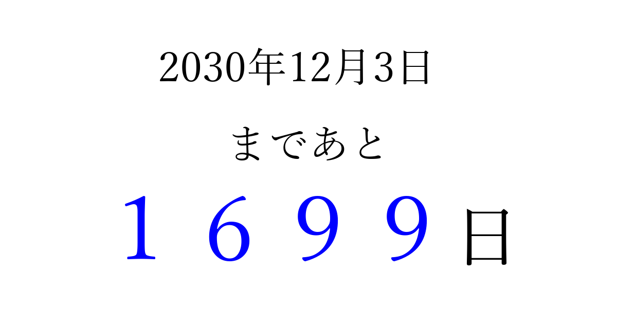 2030年12月3日(火)まで あと 9999 日です 追加すると、トップページからすぐ選べるようになります ※2026/04/09現在の結果です。 最新の状態に更新する ↓シェアして、タイムライン上にカウントダウンを表示しよう!↓ 📤 この結果を共有する Tweet シェア Threads Bluesky 別の日付でカウントダウン 2030年12月のカレンダー このページをブックマークに追加すると、いつでもカウントダウンを確認できます。 (PC: Ctrl+D / Mac: ⌘+D) hitome-notes.comでは以下のページも運営しています。 指定日と期間から日付を計算 | ガチャ確率計算・シミュレーション | プライバシー・ポリシー 運営者:Avocado