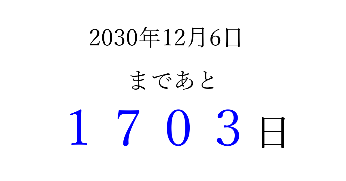 2030年12月6日(金)まで あと 9999 日です 追加すると、トップページからすぐ選べるようになります ※2026/04/08現在の結果です。 最新の状態に更新する ↓シェアして、タイムライン上にカウントダウンを表示しよう!↓ 📤 この結果を共有する Tweet シェア Threads Bluesky 別の日付でカウントダウン 2030年12月のカレンダー このページをブックマークに追加すると、いつでもカウントダウンを確認できます。 (PC: Ctrl+D / Mac: ⌘+D) hitome-notes.comでは以下のページも運営しています。 指定日と期間から日付を計算 | ガチャ確率計算・シミュレーション | プライバシー・ポリシー 運営者:Avocado