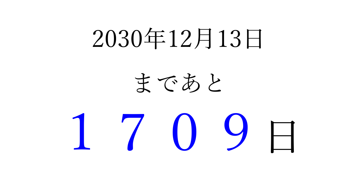 2030年12月13日(金)まで あと 9999 日です 追加すると、トップページからすぐ選べるようになります ※2026/04/09現在の結果です。 最新の状態に更新する ↓シェアして、タイムライン上にカウントダウンを表示しよう!↓ 📤 この結果を共有する Tweet シェア Threads Bluesky 別の日付でカウントダウン 2030年12月のカレンダー このページをブックマークに追加すると、いつでもカウントダウンを確認できます。 (PC: Ctrl+D / Mac: ⌘+D) hitome-notes.comでは以下のページも運営しています。 指定日と期間から日付を計算 | ガチャ確率計算・シミュレーション | プライバシー・ポリシー 運営者:Avocado