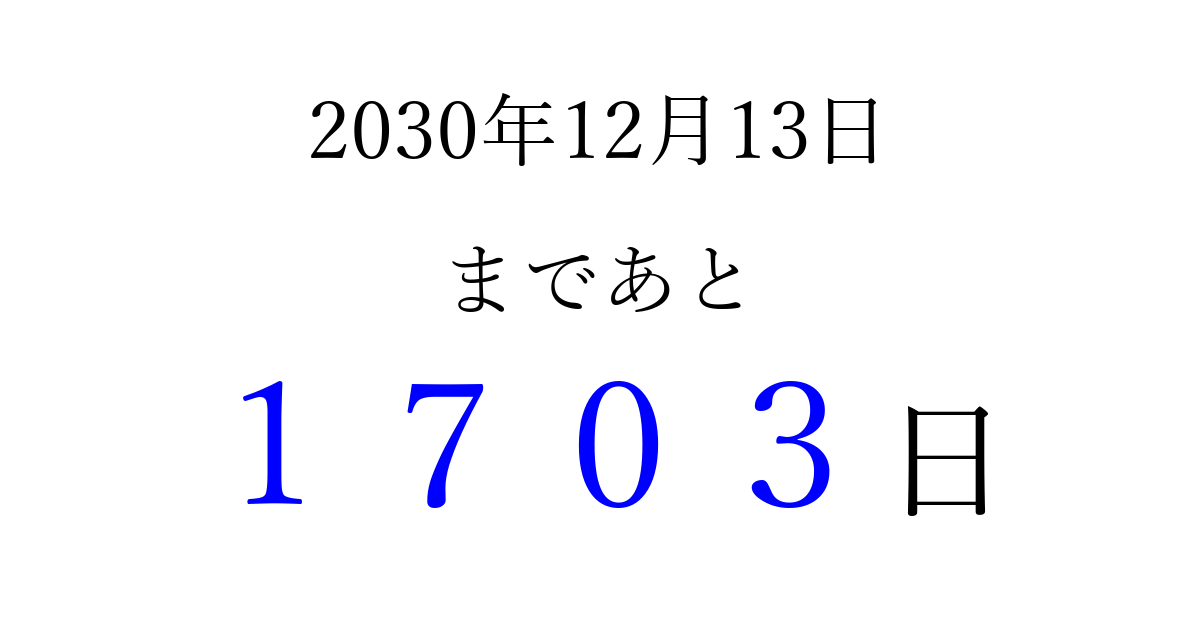 2030年12月13日(金)まで あと 9999 日です 追加すると、トップページからすぐ選べるようになります ※2026/04/15現在の結果です。 最新の状態に更新する ↓シェアして、タイムライン上にカウントダウンを表示しよう!↓ 📤 この結果を共有する Tweet シェア Threads Bluesky 別の日付でカウントダウン 2030年12月のカレンダー このページをブックマークに追加すると、いつでもカウントダウンを確認できます。 (PC: Ctrl+D / Mac: ⌘+D) hitome-notes.comでは以下のページも運営しています。 指定日と期間から日付を計算 | ガチャ確率計算・シミュレーション | プライバシー・ポリシー 運営者:Avocado