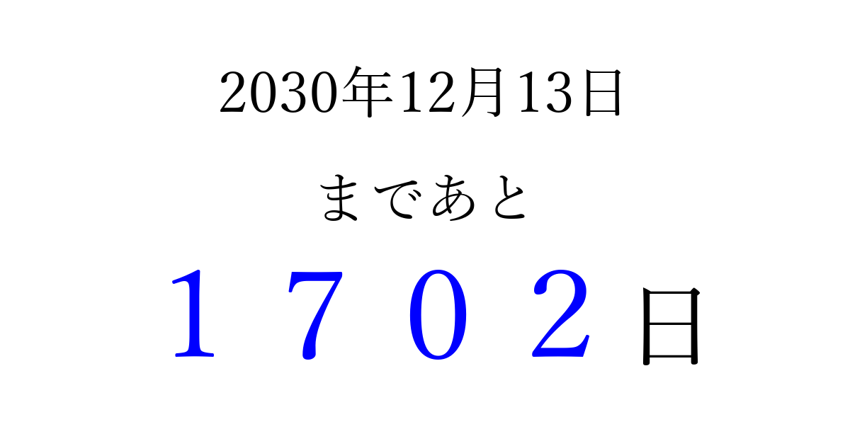 2030年12月13日(金)まで あと 9999 日です 追加すると、トップページからすぐ選べるようになります ※2026/04/16現在の結果です。 最新の状態に更新する ↓シェアして、タイムライン上にカウントダウンを表示しよう!↓ 📤 この結果を共有する Tweet シェア Threads Bluesky 別の日付でカウントダウン 2030年12月のカレンダー このページをブックマークに追加すると、いつでもカウントダウンを確認できます。 (PC: Ctrl+D / Mac: ⌘+D) hitome-notes.comでは以下のページも運営しています。 指定日と期間から日付を計算 | ガチャ確率計算・シミュレーション | プライバシー・ポリシー 運営者:Avocado