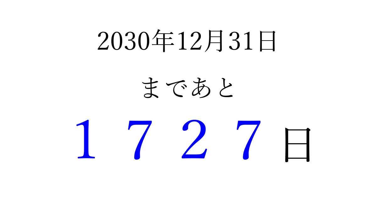2030年12月31日(火)まで あと 9999 日です 追加すると、トップページからすぐ選べるようになります ※2026/04/09現在の結果です。 最新の状態に更新する ↓シェアして、タイムライン上にカウントダウンを表示しよう!↓ 📤 この結果を共有する Tweet シェア Threads Bluesky 別の日付でカウントダウン 2030年12月のカレンダー このページをブックマークに追加すると、いつでもカウントダウンを確認できます。 (PC: Ctrl+D / Mac: ⌘+D) hitome-notes.comでは以下のページも運営しています。 指定日と期間から日付を計算 | ガチャ確率計算・シミュレーション | プライバシー・ポリシー 運営者:Avocado