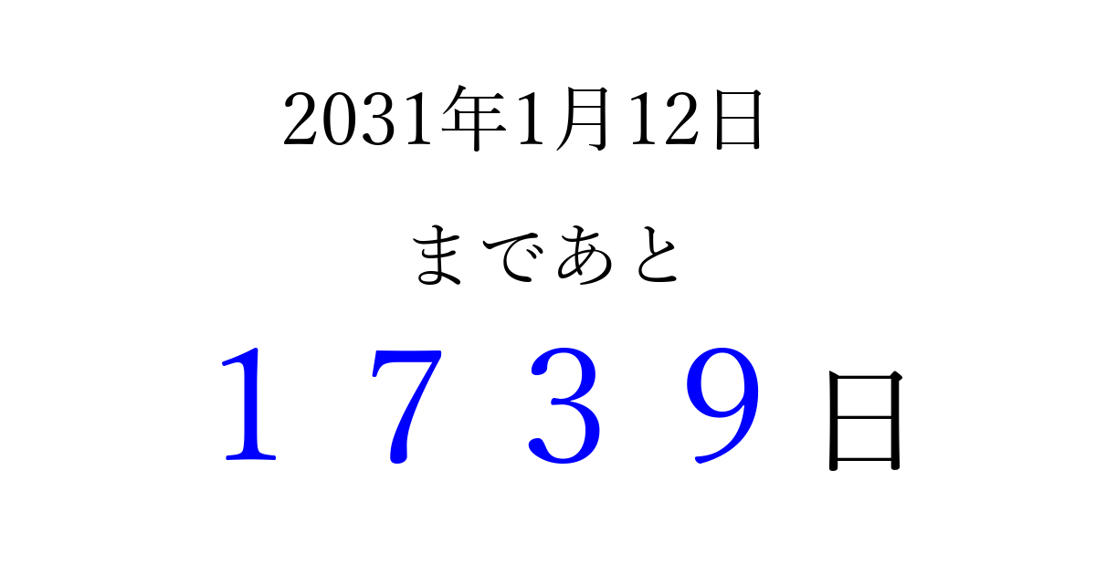2031年1月12日(日)まで あと 9999 日です 追加すると、トップページからすぐ選べるようになります ※2026/04/09現在の結果です。 最新の状態に更新する ↓シェアして、タイムライン上にカウントダウンを表示しよう!↓ 📤 この結果を共有する Tweet シェア Threads Bluesky 別の日付でカウントダウン 2031年1月のカレンダー このページをブックマークに追加すると、いつでもカウントダウンを確認できます。 (PC: Ctrl+D / Mac: ⌘+D) hitome-notes.comでは以下のページも運営しています。 指定日と期間から日付を計算 | ガチャ確率計算・シミュレーション | プライバシー・ポリシー 運営者:Avocado