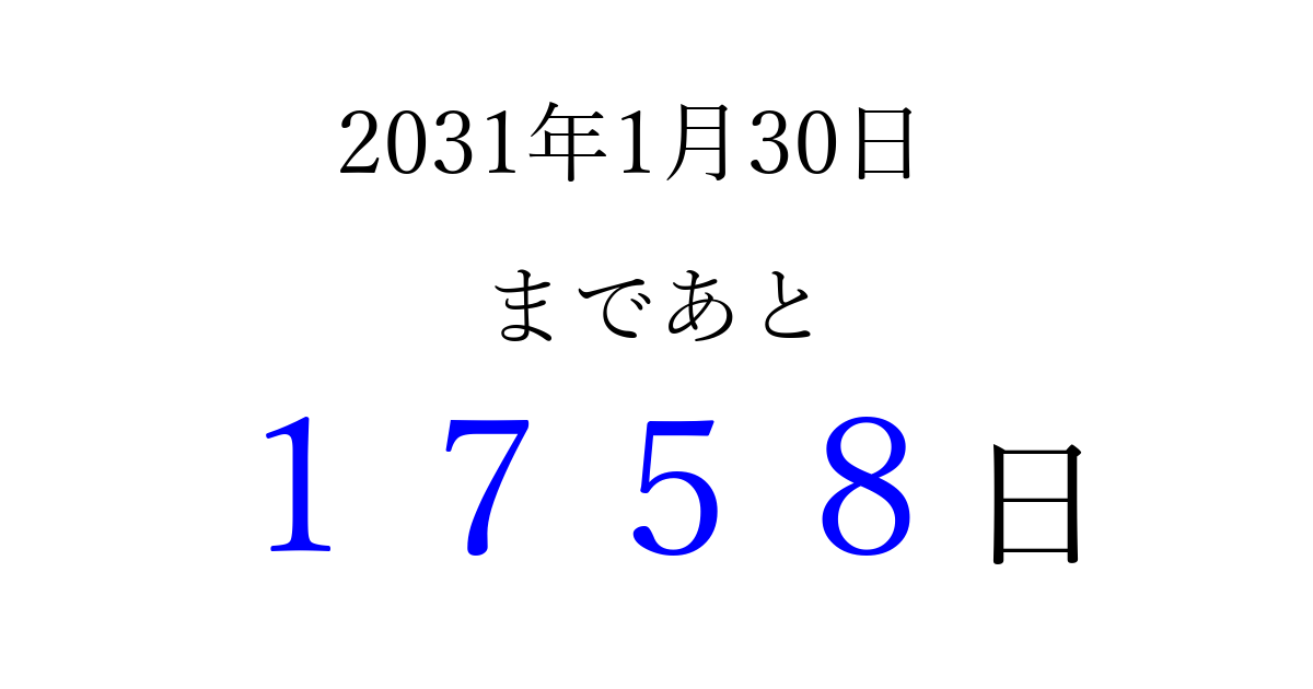 2031年1月30日(木)まで あと 9999 日です 追加すると、トップページからすぐ選べるようになります ※2026/04/08現在の結果です。 最新の状態に更新する ↓シェアして、タイムライン上にカウントダウンを表示しよう!↓ 📤 この結果を共有する Tweet シェア Threads Bluesky 別の日付でカウントダウン 2031年1月のカレンダー このページをブックマークに追加すると、いつでもカウントダウンを確認できます。 (PC: Ctrl+D / Mac: ⌘+D) hitome-notes.comでは以下のページも運営しています。 指定日と期間から日付を計算 | ガチャ確率計算・シミュレーション | プライバシー・ポリシー 運営者:Avocado