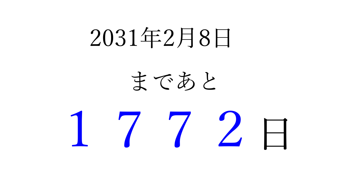 2031年2月8日(土)まで あと 9999 日です 追加すると、トップページからすぐ選べるようになります ※2026/04/03現在の結果です。 最新の状態に更新する ↓シェアして、タイムライン上にカウントダウンを表示しよう!↓ 📤 この結果を共有する Tweet シェア Threads Bluesky 別の日付でカウントダウン 2031年2月のカレンダー このページをブックマークに追加すると、いつでもカウントダウンを確認できます。 (PC: Ctrl+D / Mac: ⌘+D) hitome-notes.comでは以下のページも運営しています。 指定日と期間から日付を計算 | ガチャ確率計算・シミュレーション | プライバシー・ポリシー 運営者:Avocado
