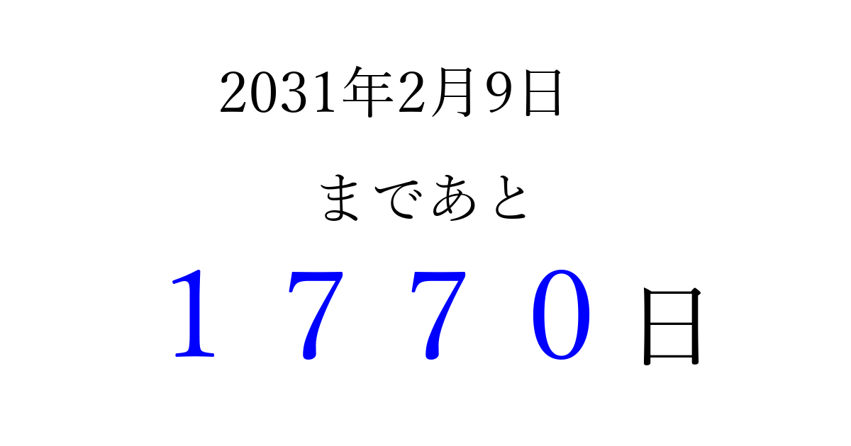 2031年2月9日(日)まで あと 9999 日です 追加すると、トップページからすぐ選べるようになります ※2026/04/06現在の結果です。 最新の状態に更新する ↓シェアして、タイムライン上にカウントダウンを表示しよう!↓ 📤 この結果を共有する Tweet シェア Threads Bluesky 別の日付でカウントダウン 2031年2月のカレンダー このページをブックマークに追加すると、いつでもカウントダウンを確認できます。 (PC: Ctrl+D / Mac: ⌘+D) hitome-notes.comでは以下のページも運営しています。 指定日と期間から日付を計算 | ガチャ確率計算・シミュレーション | プライバシー・ポリシー 運営者:Avocado