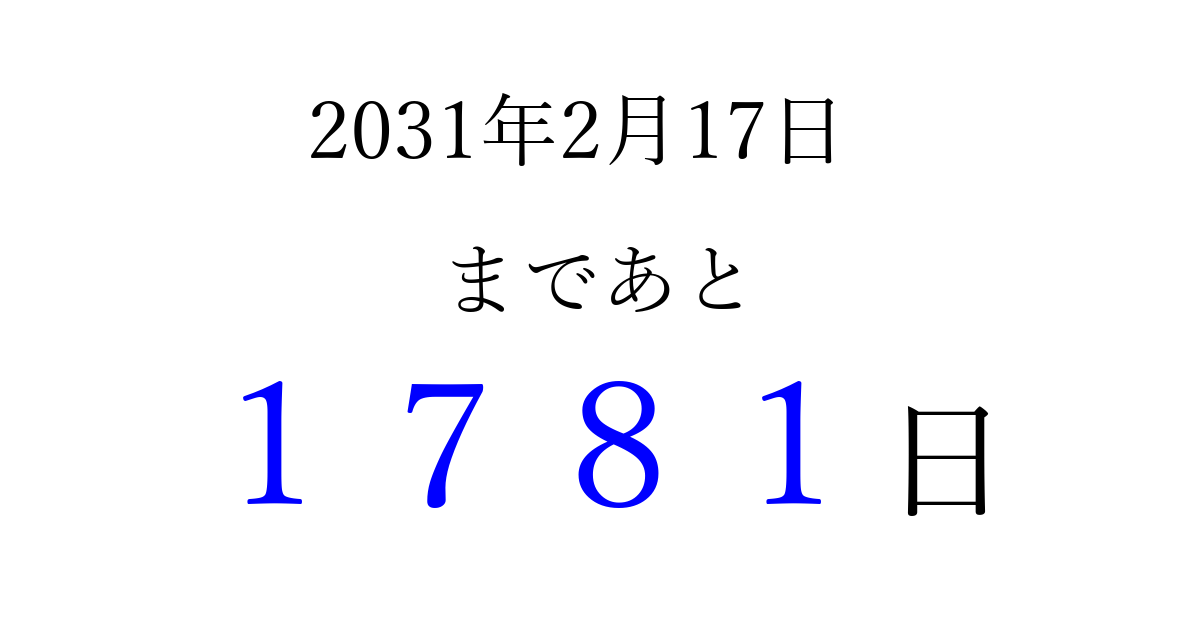 2031年2月17日(月)まで あと 9999 日です 追加すると、トップページからすぐ選べるようになります ※2026/04/03現在の結果です。 最新の状態に更新する ↓シェアして、タイムライン上にカウントダウンを表示しよう!↓ 📤 この結果を共有する Tweet シェア Threads Bluesky 別の日付でカウントダウン 2031年2月のカレンダー このページをブックマークに追加すると、いつでもカウントダウンを確認できます。 (PC: Ctrl+D / Mac: ⌘+D) hitome-notes.comでは以下のページも運営しています。 指定日と期間から日付を計算 | ガチャ確率計算・シミュレーション | プライバシー・ポリシー 運営者:Avocado