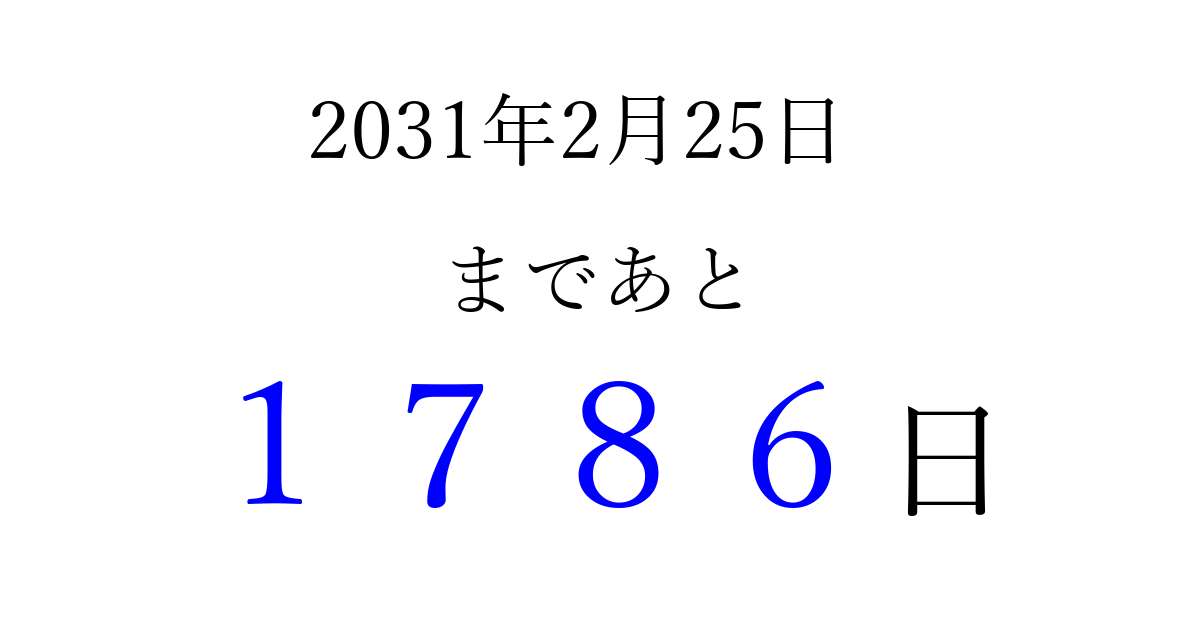 2031年2月25日(火)まで あと 9999 日です 追加すると、トップページからすぐ選べるようになります ※2026/04/06現在の結果です。 最新の状態に更新する ↓シェアして、タイムライン上にカウントダウンを表示しよう!↓ 📤 この結果を共有する Tweet シェア Threads Bluesky 別の日付でカウントダウン 2031年2月のカレンダー このページをブックマークに追加すると、いつでもカウントダウンを確認できます。 (PC: Ctrl+D / Mac: ⌘+D) hitome-notes.comでは以下のページも運営しています。 指定日と期間から日付を計算 | ガチャ確率計算・シミュレーション | プライバシー・ポリシー 運営者:Avocado