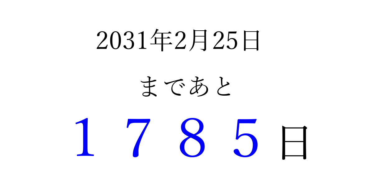 2031年2月25日(火)まで あと 9999 日です 追加すると、トップページからすぐ選べるようになります ※2026/04/07現在の結果です。 最新の状態に更新する ↓シェアして、タイムライン上にカウントダウンを表示しよう!↓ 📤 この結果を共有する Tweet シェア Threads Bluesky 別の日付でカウントダウン 2031年2月のカレンダー このページをブックマークに追加すると、いつでもカウントダウンを確認できます。 (PC: Ctrl+D / Mac: ⌘+D) hitome-notes.comでは以下のページも運営しています。 指定日と期間から日付を計算 | ガチャ確率計算・シミュレーション | プライバシー・ポリシー 運営者:Avocado