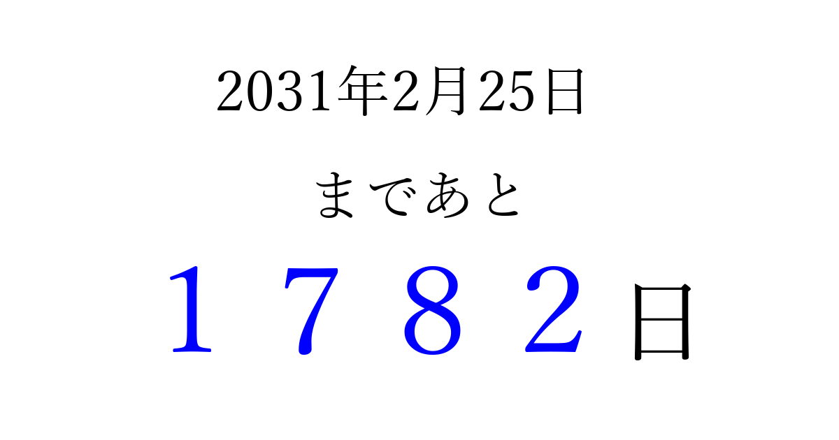 2031年2月25日(火)まで あと 9999 日です 追加すると、トップページからすぐ選べるようになります ※2026/04/10現在の結果です。 最新の状態に更新する ↓シェアして、タイムライン上にカウントダウンを表示しよう!↓ 📤 この結果を共有する Tweet シェア Threads Bluesky 別の日付でカウントダウン 2031年2月のカレンダー このページをブックマークに追加すると、いつでもカウントダウンを確認できます。 (PC: Ctrl+D / Mac: ⌘+D) hitome-notes.comでは以下のページも運営しています。 指定日と期間から日付を計算 | ガチャ確率計算・シミュレーション | プライバシー・ポリシー 運営者:Avocado