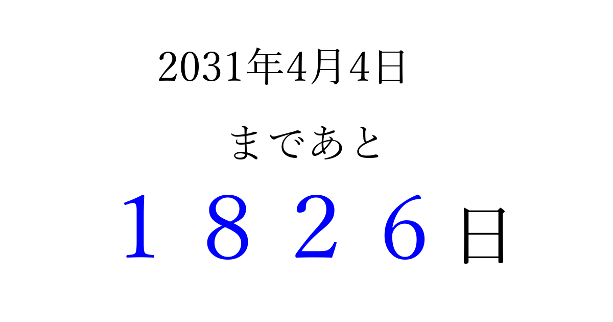2031年4月4日(金)まで あと 9999 日です 追加すると、トップページからすぐ選べるようになります ※2026/04/04現在の結果です。 最新の状態に更新する ↓シェアして、タイムライン上にカウントダウンを表示しよう!↓ 📤 この結果を共有する Tweet シェア Threads Bluesky 別の日付でカウントダウン 2031年4月のカレンダー このページをブックマークに追加すると、いつでもカウントダウンを確認できます。 (PC: Ctrl+D / Mac: ⌘+D) hitome-notes.comでは以下のページも運営しています。 指定日と期間から日付を計算 | ガチャ確率計算・シミュレーション | プライバシー・ポリシー 運営者:Avocado
