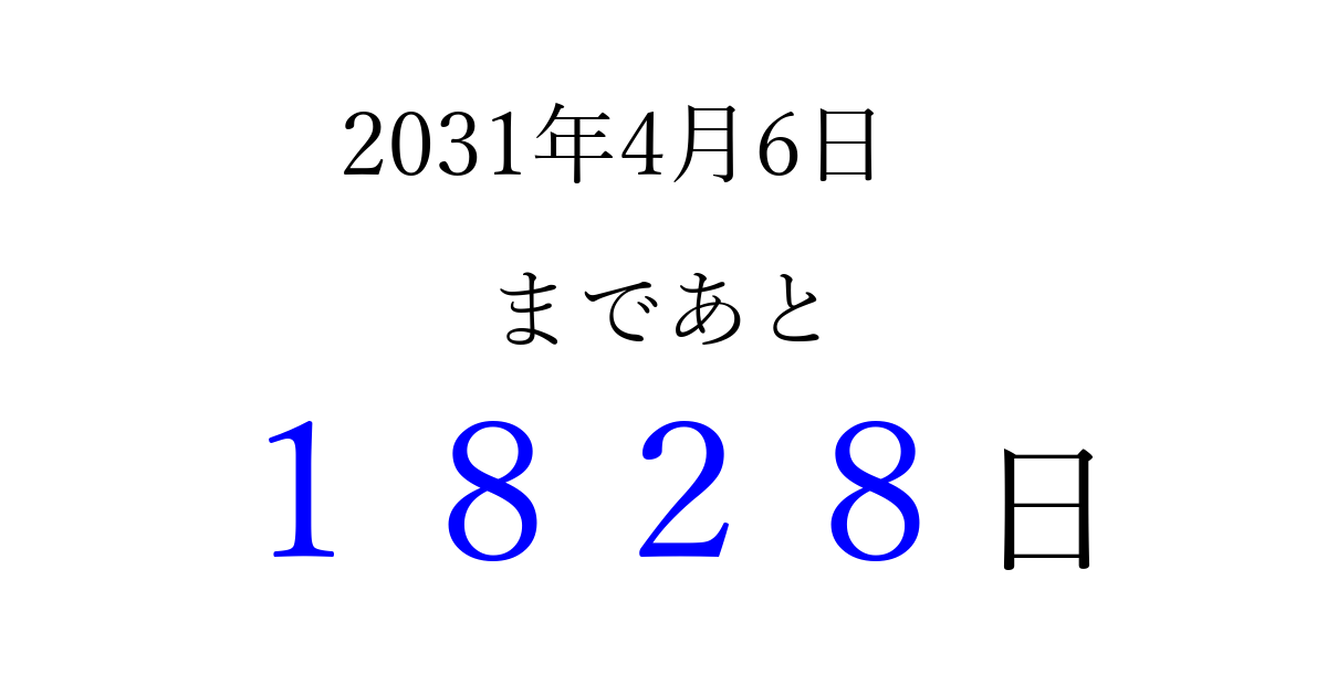 2031年4月6日(日)まで あと 9999 日です 追加すると、トップページからすぐ選べるようになります ※2026/04/04現在の結果です。 最新の状態に更新する ↓シェアして、タイムライン上にカウントダウンを表示しよう!↓ 📤 この結果を共有する Tweet シェア Threads Bluesky 別の日付でカウントダウン 2031年4月のカレンダー このページをブックマークに追加すると、いつでもカウントダウンを確認できます。 (PC: Ctrl+D / Mac: ⌘+D) hitome-notes.comでは以下のページも運営しています。 指定日と期間から日付を計算 | ガチャ確率計算・シミュレーション | プライバシー・ポリシー 運営者:Avocado