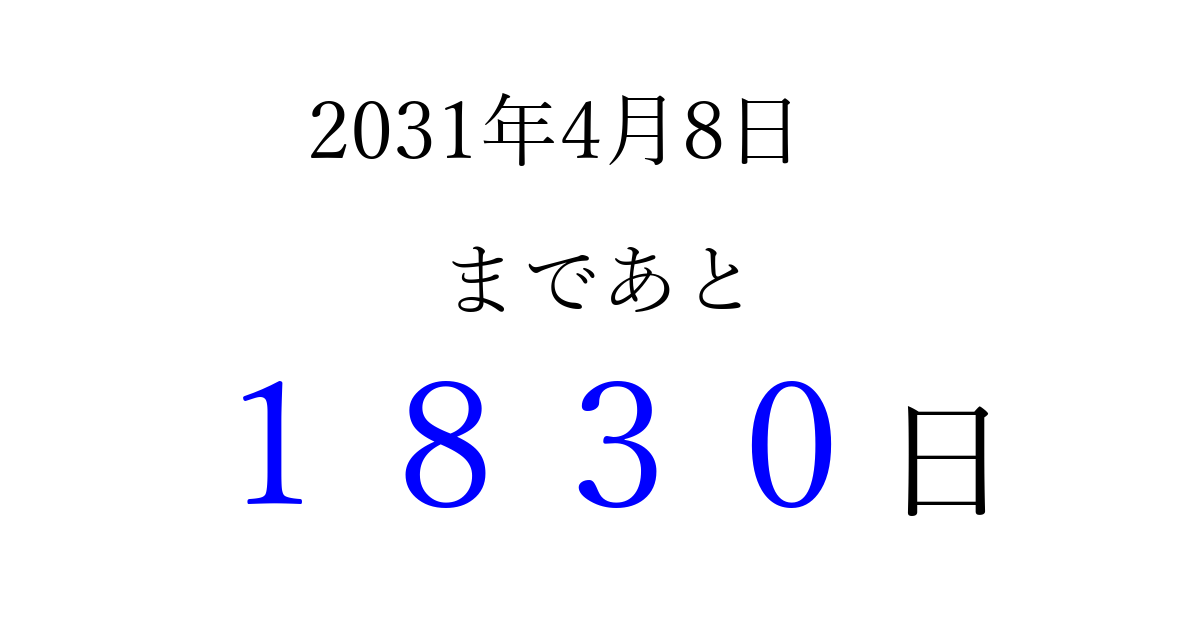 2031年4月8日(火)まで あと 9999 日です 追加すると、トップページからすぐ選べるようになります ※2026/04/04現在の結果です。 最新の状態に更新する ↓シェアして、タイムライン上にカウントダウンを表示しよう!↓ 📤 この結果を共有する Tweet シェア Threads Bluesky 別の日付でカウントダウン 2031年4月のカレンダー このページをブックマークに追加すると、いつでもカウントダウンを確認できます。 (PC: Ctrl+D / Mac: ⌘+D) hitome-notes.comでは以下のページも運営しています。 指定日と期間から日付を計算 | ガチャ確率計算・シミュレーション | プライバシー・ポリシー 運営者:Avocado