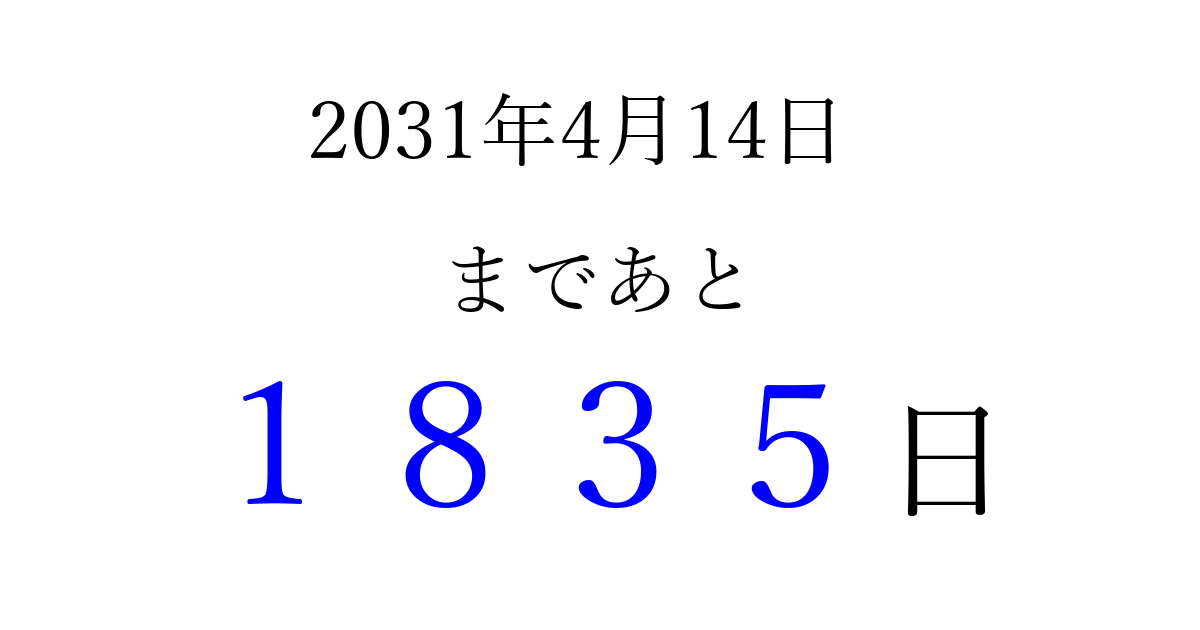 2031年4月14日(月)まで あと 9999 日です 追加すると、トップページからすぐ選べるようになります ※2026/04/05現在の結果です。 最新の状態に更新する ↓シェアして、タイムライン上にカウントダウンを表示しよう!↓ 📤 この結果を共有する Tweet シェア Threads Bluesky 別の日付でカウントダウン 2031年4月のカレンダー このページをブックマークに追加すると、いつでもカウントダウンを確認できます。 (PC: Ctrl+D / Mac: ⌘+D) hitome-notes.comでは以下のページも運営しています。 指定日と期間から日付を計算 | ガチャ確率計算・シミュレーション | プライバシー・ポリシー 運営者:Avocado