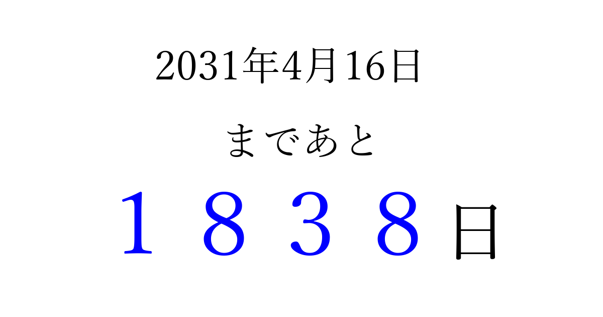 2031年4月16日(水)まで あと 9999 日です 追加すると、トップページからすぐ選べるようになります ※2026/04/04現在の結果です。 最新の状態に更新する ↓シェアして、タイムライン上にカウントダウンを表示しよう!↓ 📤 この結果を共有する Tweet シェア Threads Bluesky 別の日付でカウントダウン 2031年4月のカレンダー このページをブックマークに追加すると、いつでもカウントダウンを確認できます。 (PC: Ctrl+D / Mac: ⌘+D) hitome-notes.comでは以下のページも運営しています。 指定日と期間から日付を計算 | ガチャ確率計算・シミュレーション | プライバシー・ポリシー 運営者:Avocado