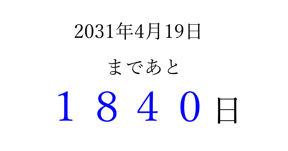 2031年4月19日(土)まで あと 9999 日です 追加すると、トップページからすぐ選べるようになります ※2026/04/05現在の結果です。 最新の状態に更新する ↓シェアして、タイムライン上にカウントダウンを表示しよう!↓ 📤 この結果を共有する Tweet シェア Threads Bluesky 別の日付でカウントダウン 2031年4月のカレンダー このページをブックマークに追加すると、いつでもカウントダウンを確認できます。 (PC: Ctrl+D / Mac: ⌘+D) hitome-notes.comでは以下のページも運営しています。 指定日と期間から日付を計算 | ガチャ確率計算・シミュレーション | プライバシー・ポリシー 運営者:Avocado
