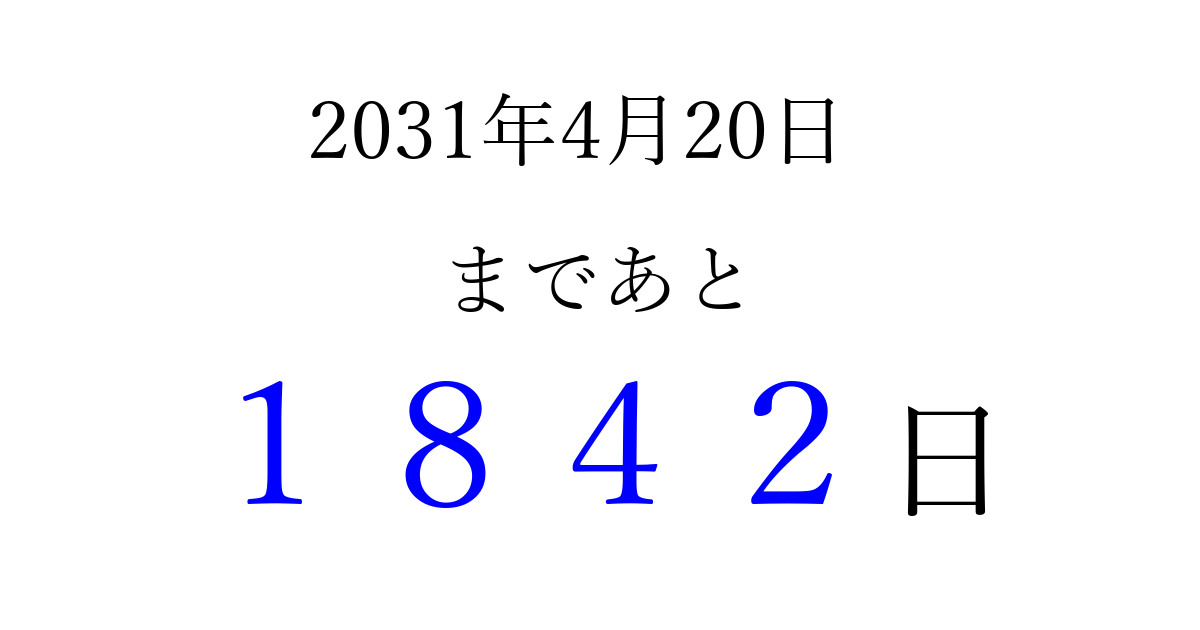 2031年4月20日(日)まで あと 9999 日です 追加すると、トップページからすぐ選べるようになります ※2026/04/04現在の結果です。 最新の状態に更新する ↓シェアして、タイムライン上にカウントダウンを表示しよう!↓ 📤 この結果を共有する Tweet シェア Threads Bluesky 別の日付でカウントダウン 2031年4月のカレンダー このページをブックマークに追加すると、いつでもカウントダウンを確認できます。 (PC: Ctrl+D / Mac: ⌘+D) hitome-notes.comでは以下のページも運営しています。 指定日と期間から日付を計算 | ガチャ確率計算・シミュレーション | プライバシー・ポリシー 運営者:Avocado