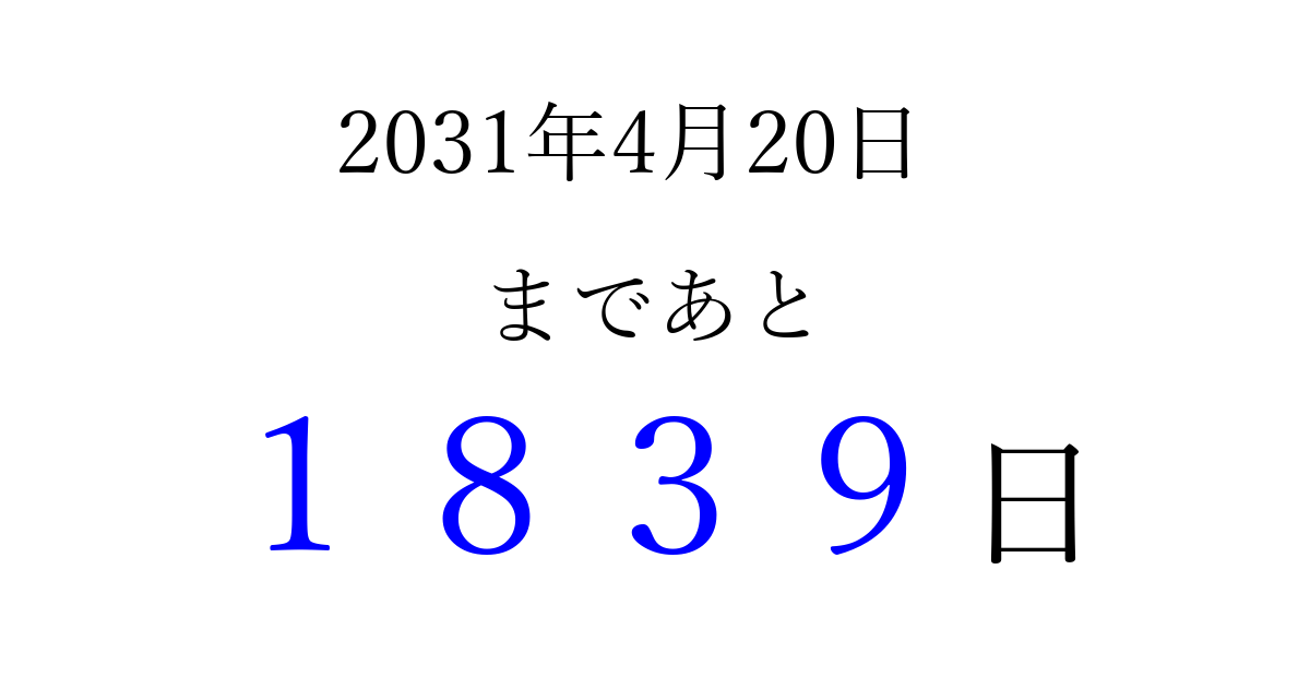2031年4月20日(日)まで あと 9999 日です 追加すると、トップページからすぐ選べるようになります ※2026/04/07現在の結果です。 最新の状態に更新する ↓シェアして、タイムライン上にカウントダウンを表示しよう!↓ 📤 この結果を共有する Tweet シェア Threads Bluesky 別の日付でカウントダウン 2031年4月のカレンダー このページをブックマークに追加すると、いつでもカウントダウンを確認できます。 (PC: Ctrl+D / Mac: ⌘+D) hitome-notes.comでは以下のページも運営しています。 指定日と期間から日付を計算 | ガチャ確率計算・シミュレーション | プライバシー・ポリシー 運営者:Avocado
