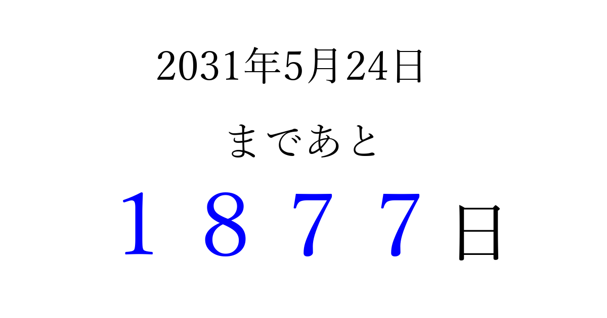 2031年5月24日(土)まで あと 9999 日です 追加すると、トップページからすぐ選べるようになります ※2026/04/03現在の結果です。 最新の状態に更新する ↓シェアして、タイムライン上にカウントダウンを表示しよう!↓ 📤 この結果を共有する Tweet シェア Threads Bluesky 別の日付でカウントダウン 2031年5月のカレンダー このページをブックマークに追加すると、いつでもカウントダウンを確認できます。 (PC: Ctrl+D / Mac: ⌘+D) hitome-notes.comでは以下のページも運営しています。 指定日と期間から日付を計算 | ガチャ確率計算・シミュレーション | プライバシー・ポリシー 運営者:Avocado