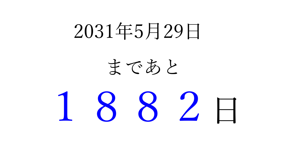 2031年5月29日(木)まで あと 9999 日です 追加すると、トップページからすぐ選べるようになります ※2026/04/03現在の結果です。 最新の状態に更新する ↓シェアして、タイムライン上にカウントダウンを表示しよう!↓ 📤 この結果を共有する Tweet シェア Threads Bluesky 別の日付でカウントダウン 2031年5月のカレンダー このページをブックマークに追加すると、いつでもカウントダウンを確認できます。 (PC: Ctrl+D / Mac: ⌘+D) hitome-notes.comでは以下のページも運営しています。 指定日と期間から日付を計算 | ガチャ確率計算・シミュレーション | プライバシー・ポリシー 運営者:Avocado
