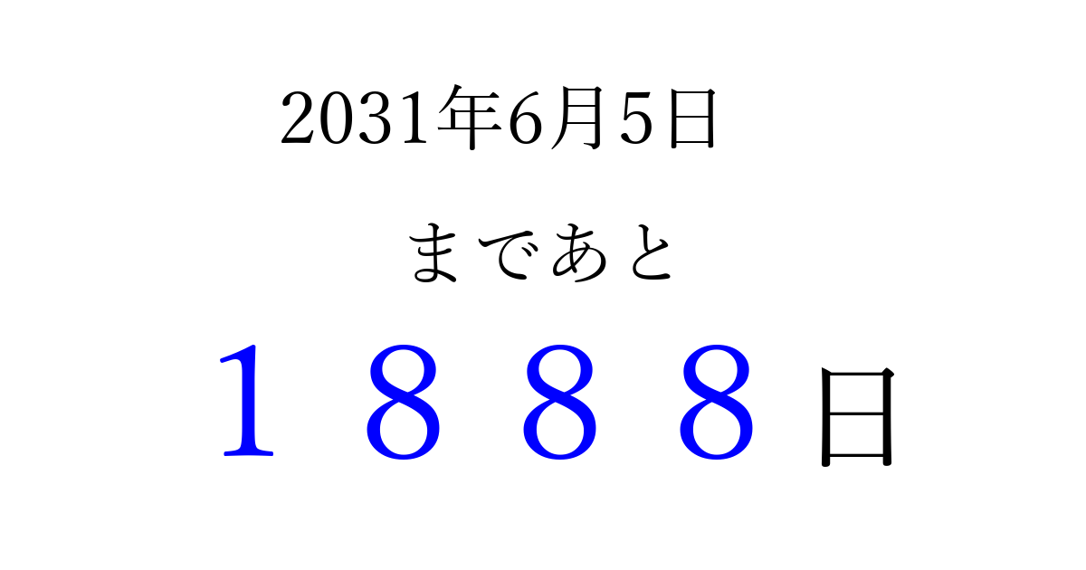 2031年6月5日(木)まで あと 9999 日です 追加すると、トップページからすぐ選べるようになります ※2026/04/04現在の結果です。 最新の状態に更新する ↓シェアして、タイムライン上にカウントダウンを表示しよう!↓ 📤 この結果を共有する Tweet シェア Threads Bluesky 別の日付でカウントダウン 2031年6月のカレンダー このページをブックマークに追加すると、いつでもカウントダウンを確認できます。 (PC: Ctrl+D / Mac: ⌘+D) hitome-notes.comでは以下のページも運営しています。 指定日と期間から日付を計算 | ガチャ確率計算・シミュレーション | プライバシー・ポリシー 運営者:Avocado