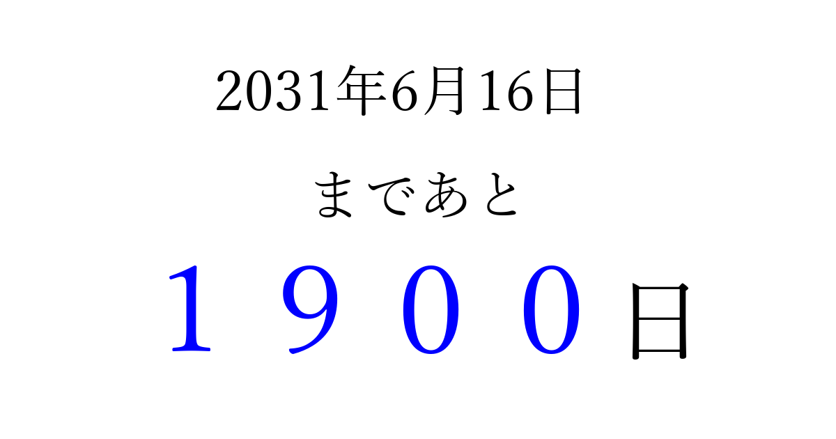 2031年6月16日(月)まで あと 9999 日です 追加すると、トップページからすぐ選べるようになります ※2026/04/03現在の結果です。 最新の状態に更新する ↓シェアして、タイムライン上にカウントダウンを表示しよう!↓ 📤 この結果を共有する Tweet シェア Threads Bluesky 別の日付でカウントダウン 2031年6月のカレンダー このページをブックマークに追加すると、いつでもカウントダウンを確認できます。 (PC: Ctrl+D / Mac: ⌘+D) hitome-notes.comでは以下のページも運営しています。 指定日と期間から日付を計算 | ガチャ確率計算・シミュレーション | プライバシー・ポリシー 運営者:Avocado