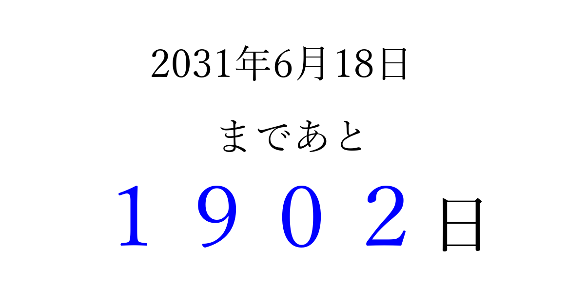 2031年6月18日(水)まで あと 9999 日です 追加すると、トップページからすぐ選べるようになります ※2026/04/03現在の結果です。 最新の状態に更新する ↓シェアして、タイムライン上にカウントダウンを表示しよう!↓ 📤 この結果を共有する Tweet シェア Threads Bluesky 別の日付でカウントダウン 2031年6月のカレンダー このページをブックマークに追加すると、いつでもカウントダウンを確認できます。 (PC: Ctrl+D / Mac: ⌘+D) hitome-notes.comでは以下のページも運営しています。 指定日と期間から日付を計算 | ガチャ確率計算・シミュレーション | プライバシー・ポリシー 運営者:Avocado