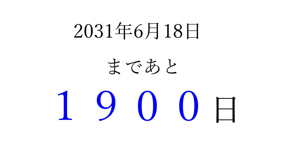 2031年6月18日(水)まで あと 9999 日です 追加すると、トップページからすぐ選べるようになります ※2026/04/05現在の結果です。 最新の状態に更新する ↓シェアして、タイムライン上にカウントダウンを表示しよう!↓ 📤 この結果を共有する Tweet シェア Threads Bluesky 別の日付でカウントダウン 2031年6月のカレンダー このページをブックマークに追加すると、いつでもカウントダウンを確認できます。 (PC: Ctrl+D / Mac: ⌘+D) hitome-notes.comでは以下のページも運営しています。 指定日と期間から日付を計算 | ガチャ確率計算・シミュレーション | プライバシー・ポリシー 運営者:Avocado