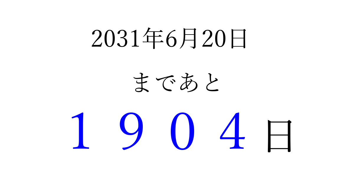 2031年6月20日(金)まで あと 9999 日です 追加すると、トップページからすぐ選べるようになります ※2026/04/03現在の結果です。 最新の状態に更新する ↓シェアして、タイムライン上にカウントダウンを表示しよう!↓ 📤 この結果を共有する Tweet シェア Threads Bluesky 別の日付でカウントダウン 2031年6月のカレンダー このページをブックマークに追加すると、いつでもカウントダウンを確認できます。 (PC: Ctrl+D / Mac: ⌘+D) hitome-notes.comでは以下のページも運営しています。 指定日と期間から日付を計算 | ガチャ確率計算・シミュレーション | プライバシー・ポリシー 運営者:Avocado