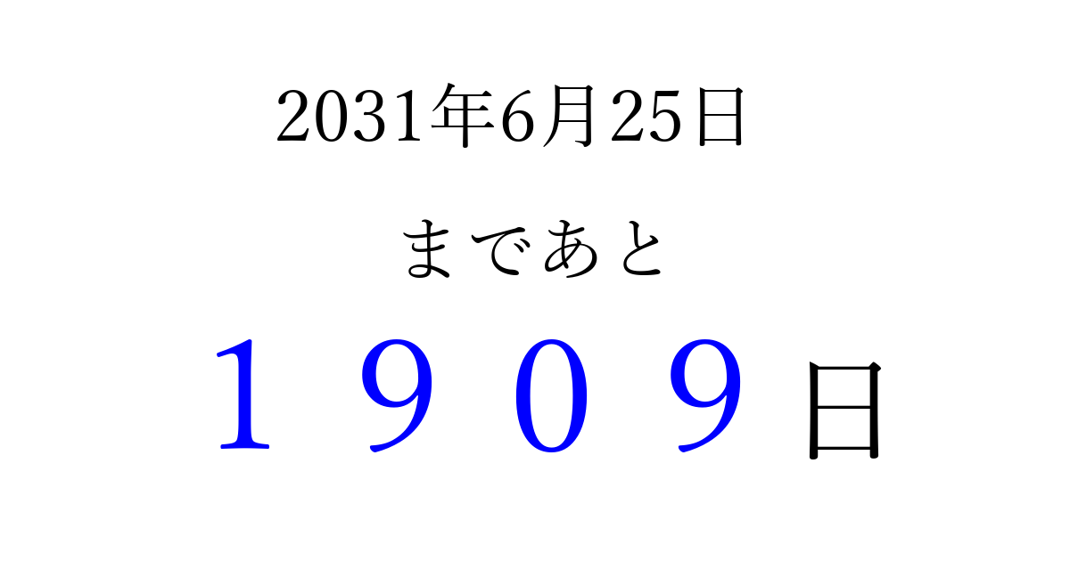 2031年6月25日(水)まで あと 9999 日です 追加すると、トップページからすぐ選べるようになります ※2026/04/03現在の結果です。 最新の状態に更新する ↓シェアして、タイムライン上にカウントダウンを表示しよう!↓ 📤 この結果を共有する Tweet シェア Threads Bluesky 別の日付でカウントダウン 2031年6月のカレンダー このページをブックマークに追加すると、いつでもカウントダウンを確認できます。 (PC: Ctrl+D / Mac: ⌘+D) hitome-notes.comでは以下のページも運営しています。 指定日と期間から日付を計算 | ガチャ確率計算・シミュレーション | プライバシー・ポリシー 運営者:Avocado