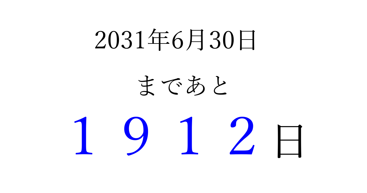2031年6月30日(月)まで あと 9999 日です 追加すると、トップページからすぐ選べるようになります ※2026/04/05現在の結果です。 最新の状態に更新する ↓シェアして、タイムライン上にカウントダウンを表示しよう!↓ 📤 この結果を共有する Tweet シェア Threads Bluesky 別の日付でカウントダウン 2031年6月のカレンダー このページをブックマークに追加すると、いつでもカウントダウンを確認できます。 (PC: Ctrl+D / Mac: ⌘+D) hitome-notes.comでは以下のページも運営しています。 指定日と期間から日付を計算 | ガチャ確率計算・シミュレーション | プライバシー・ポリシー 運営者:Avocado