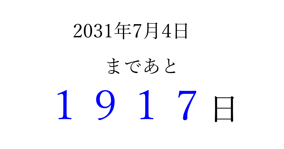 2031年7月4日(金)まで あと 9999 日です 追加すると、トップページからすぐ選べるようになります ※2026/04/04現在の結果です。 最新の状態に更新する ↓シェアして、タイムライン上にカウントダウンを表示しよう!↓ 📤 この結果を共有する Tweet シェア Threads Bluesky 別の日付でカウントダウン 2031年7月のカレンダー このページをブックマークに追加すると、いつでもカウントダウンを確認できます。 (PC: Ctrl+D / Mac: ⌘+D) hitome-notes.comでは以下のページも運営しています。 指定日と期間から日付を計算 | ガチャ確率計算・シミュレーション | プライバシー・ポリシー 運営者:Avocado