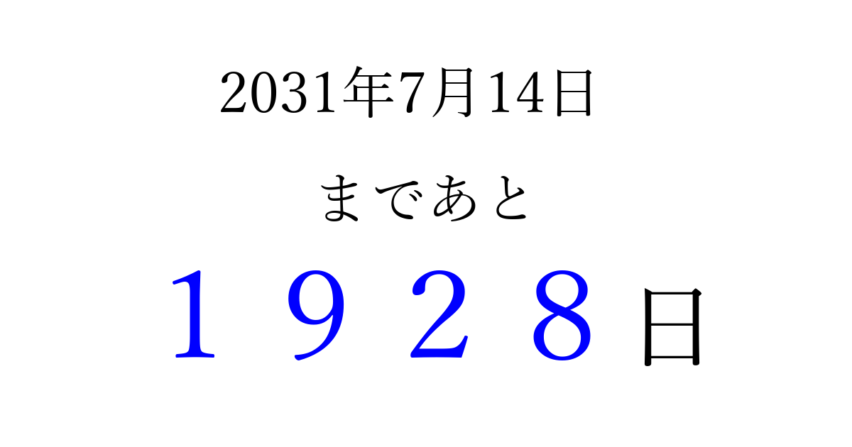 2031年7月14日(月)まで あと 9999 日です 追加すると、トップページからすぐ選べるようになります ※2026/04/03現在の結果です。 最新の状態に更新する ↓シェアして、タイムライン上にカウントダウンを表示しよう!↓ 📤 この結果を共有する Tweet シェア Threads Bluesky 別の日付でカウントダウン 2031年7月のカレンダー このページをブックマークに追加すると、いつでもカウントダウンを確認できます。 (PC: Ctrl+D / Mac: ⌘+D) hitome-notes.comでは以下のページも運営しています。 指定日と期間から日付を計算 | ガチャ確率計算・シミュレーション | プライバシー・ポリシー 運営者:Avocado