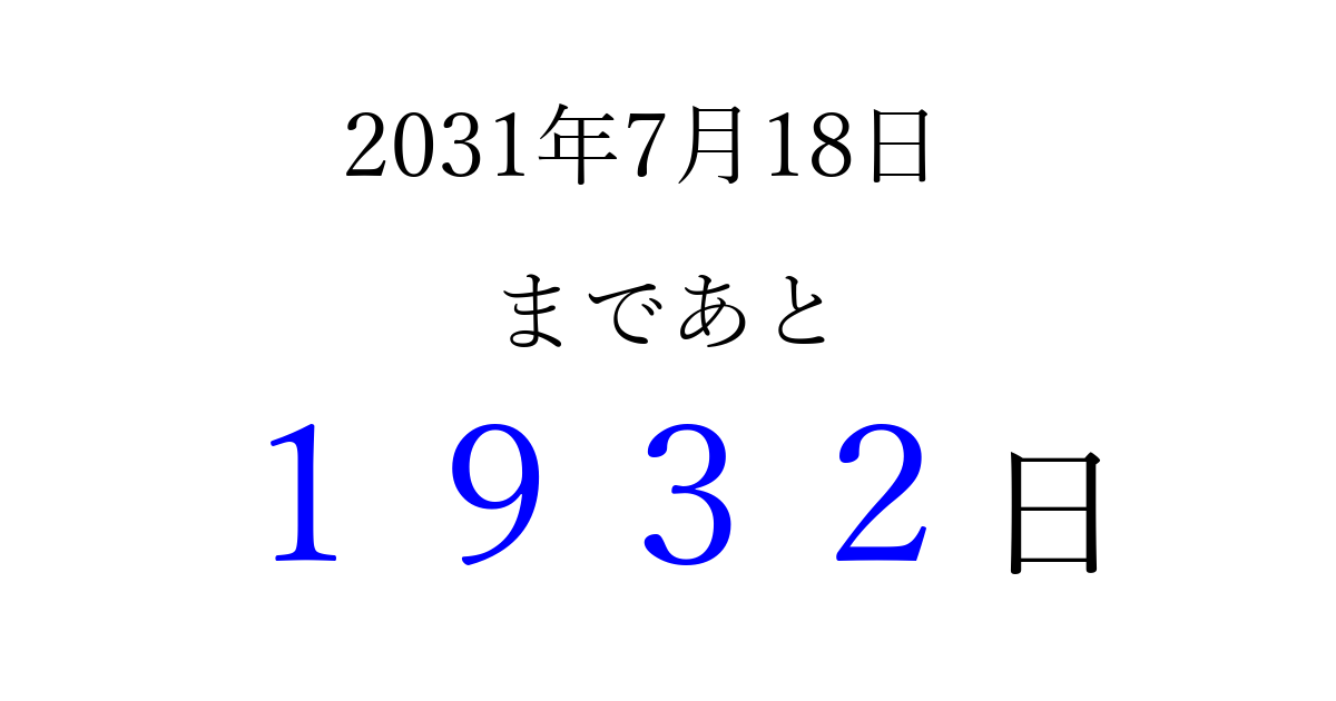 2031年7月18日(金)まで あと 9999 日です 追加すると、トップページからすぐ選べるようになります ※2026/04/03現在の結果です。 最新の状態に更新する ↓シェアして、タイムライン上にカウントダウンを表示しよう!↓ 📤 この結果を共有する Tweet シェア Threads Bluesky 別の日付でカウントダウン 2031年7月のカレンダー このページをブックマークに追加すると、いつでもカウントダウンを確認できます。 (PC: Ctrl+D / Mac: ⌘+D) hitome-notes.comでは以下のページも運営しています。 指定日と期間から日付を計算 | ガチャ確率計算・シミュレーション | プライバシー・ポリシー 運営者:Avocado