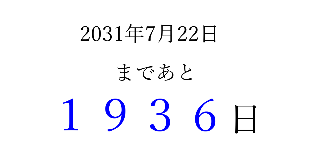 2031年7月22日(火)まで あと 9999 日です 追加すると、トップページからすぐ選べるようになります ※2026/04/03現在の結果です。 最新の状態に更新する ↓シェアして、タイムライン上にカウントダウンを表示しよう!↓ 📤 この結果を共有する Tweet シェア Threads Bluesky 別の日付でカウントダウン 2031年7月のカレンダー このページをブックマークに追加すると、いつでもカウントダウンを確認できます。 (PC: Ctrl+D / Mac: ⌘+D) hitome-notes.comでは以下のページも運営しています。 指定日と期間から日付を計算 | ガチャ確率計算・シミュレーション | プライバシー・ポリシー 運営者:Avocado
